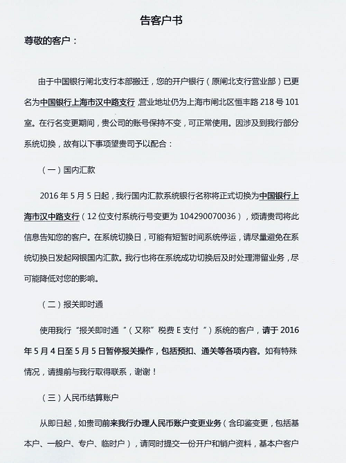 接銀行通知,2016年5月5日起,本公司開戶銀行名稱將正式變更為“中國銀行上海市漢中路支行”
