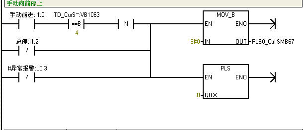 1.大家看這是一段伺服控制的程序,按下啟動按鈕伺服會開始轉(zhuǎn)動,但是怎樣讓伺服轉(zhuǎn)動過程中緊急停止呢?就是說不讓Q0.0發(fā)脈沖了。程序該怎么寫? 2.如果伺服轉(zhuǎn)動了3圈中途停止了,設(shè)定是5圈,還剩下2圈,如何再按下啟動按鈕,伺服轉(zhuǎn)完剩下的2圈? |