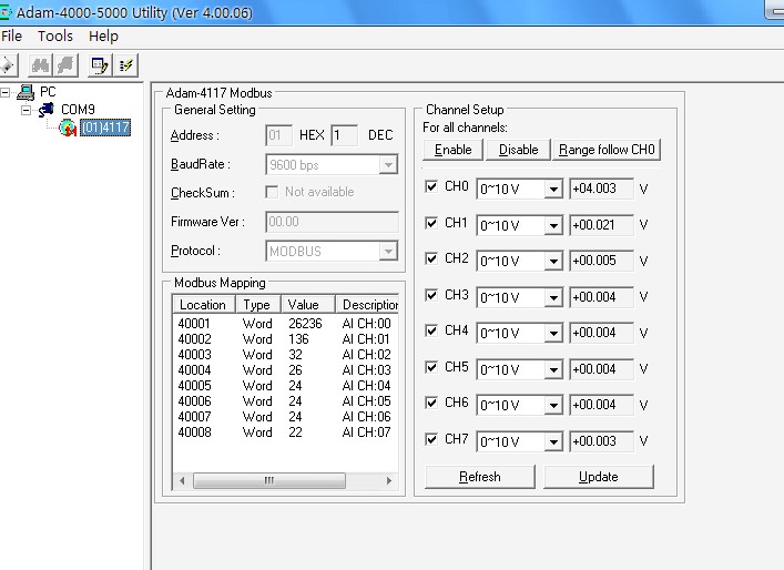 如圖所示,電腦的COM9連接的是ADAM-4117模塊,研華的軟件可以讀出40001地址的數(shù)據(jù),為什么電腦的modbus軟件讀不出呢?怎么回事,哪里的問(wèn)題?