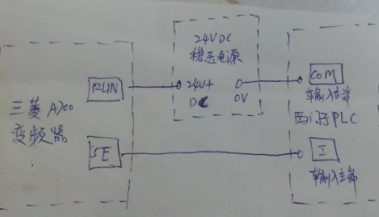 +24V接PLC的輸入公共端...0V接變頻器的SE端......RUN接PLC的輸入I端....