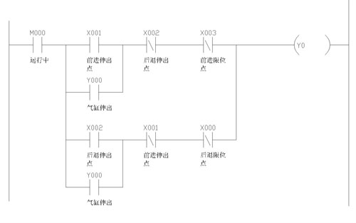 這個是在調試中有問題的電路,也是很多人沒注意的電路,如果是繼電器這個電路是沒問題的,工藝是小車在左右跑動中(X0--X3),在X2--X3中伸出汽缸,PLC是三菱FX1S的,小車速度較快,小車左右程序很簡單就不寫了(當然運行中是減速和緩沖的)。為了明了就把接近開關畫成行程開關了。找到原因了以后就會注意了。