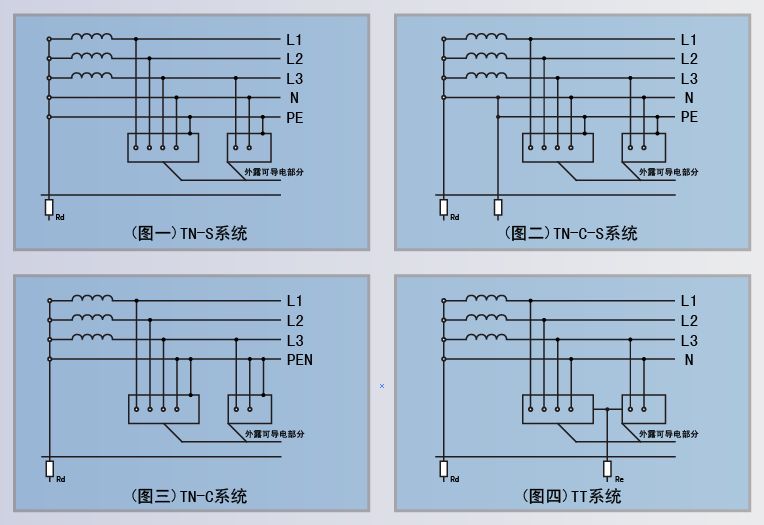 你的舊廠房“從變壓器拉電纜出來就三相線一零線,設(shè)備接地就是就近打一地線針1.5米”中,除了“打一地線針1.5米(應(yīng)2.5米)”這一點(diǎn)不規(guī)范外,將地線打至2.5米以上就規(guī)范了,這就是圖四的TT系統(tǒng)。