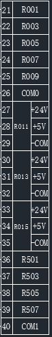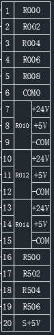 自帶的是16入8出的I/O,點位分布如圖。其中R000-R015是輸入,R500-R508是輸出。R500-R503可做高速輸出端,輸出頻率為100K。