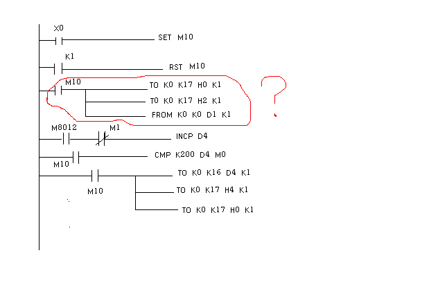 三菱FX2N,變頻器三菱E700,參數(shù)設(shè)P79=4,面板啟動(dòng),外調(diào)頻,現(xiàn)按下X0,和面板RUN,電機(jī)轉(zhuǎn),但按X1不停,程序不明白,希望大家指教謝謝。圖中紅圈部分有何用?