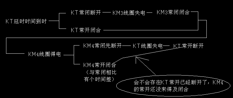 這個還不好理解嗎?看圖知道如果KM4不閉合的話KT一直得電,也就是KT的延時閉合觸點一直接通到KM4常開閉合后才打開。