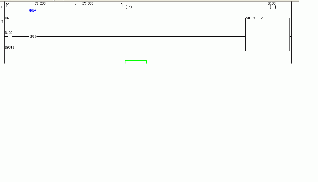 程序如圖,DT200為編碼器(360P/R)的實(shí)際角度,DT300為動(dòng)作開始角度,X4(光電開關(guān))是在角度為120-200度的時(shí)間內(nèi)的檢測(cè)信號(hào)。