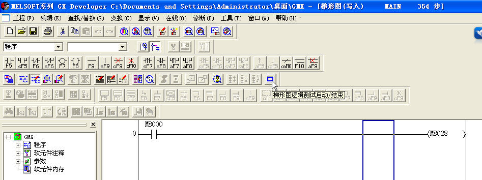 在菜單欄工具項的下拉菜單中有梯形圖邏輯測試啟動項,打開程序后,點擊測試啟動即可,另外在軟件界面快捷方式欄中有一個類似測試視力向下豁口(多一根向下線)的圖標,點擊它也行