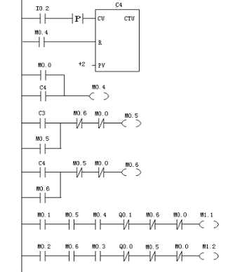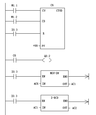 C6以上是正、反計數用。動作流程比較奇怪。I0.1先On則C6只能加,I0.2先On則C6只能減。加的時候動作順序只能是:(1)I0,1  ON  (2)I0.2  ON    (3)I0,1 ON  (4)I0,2  ON  此時C6為1  。以后I0.2每ON兩次C6數值加1  。