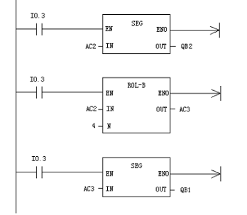 C6之后的程序好像是將C6中計數值(0~99)用QB1、QB2顯示出來(但是也要用到*AC1將C6的值取出來)。能顯示兩位數。但I0.3同時又將C6復位了……