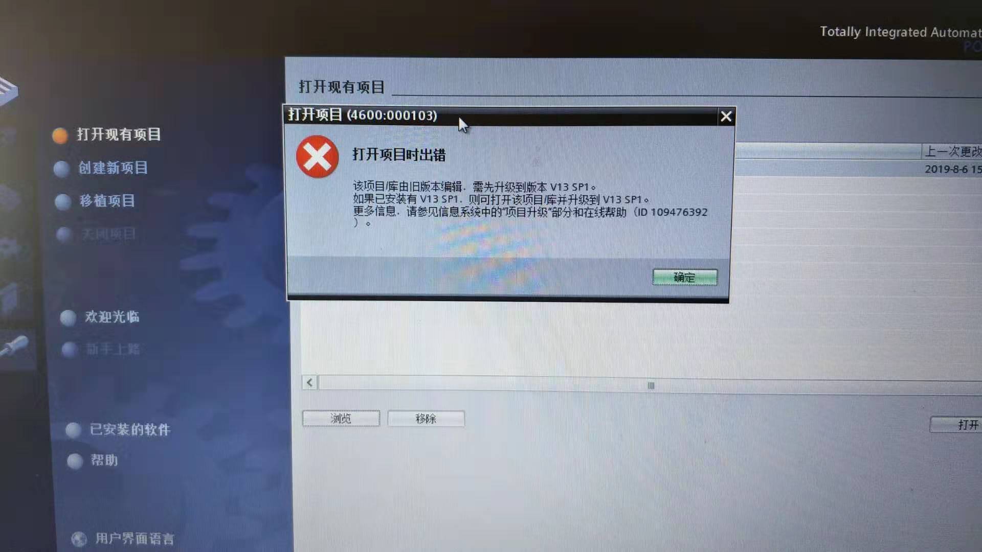 用博途V14打開V13程序時出現“打開項目出錯”對話框