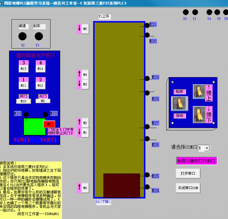 十分感謝夏日雪夢的提議,首先本程序只適用三菱FX系列PLC通訊。COM口我的解忘了加入選擇程序了。下面是我剛修改后的程序,請下載后復制到原來文件夾里替換掉原來的“四層電梯.EXE”文件即可。