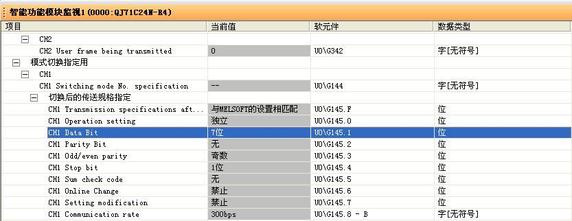 我在智能參數的《開關設置》窗口內將CH1設置為:獨立、數據位7位、校驗位有、偶校驗、停止位2位、通訊速率2400BPS、無順序協議;然后編譯下載,重啟PLC后,我登陸到QJ71C24N監視時,發現,在監視窗口中,CH1通道中顯示:獨立、數據位7位、校驗位無、奇校驗、停止位1位、通訊速率300BPS;請問如何將我想要的通訊格式下載到模塊呢?另外我也嘗試用模式切換:將Y2置1,但是模塊報錯:7E54,就是說EROM改寫被設定為禁止;后來我在開關設置里將onlinechange 和 更改設置 都設定為允許,但還是報錯,請問這個問題如何能解決呢?謝謝!