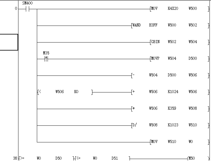 多謝了,我還以為像變頻器一樣的是通道地址,還有不明白的是為什么要加這條程序呢,傳送X20-X2F數(shù)值到W500中,我想應(yīng)該是QX40-S1讀取的格雷碼編碼器的值吧(不知對(duì)不對(duì)個(gè)人想法),再用GBIN指令轉(zhuǎn)成16位二進(jìn)制就行了啊,為什么還要加上十六進(jìn)制的3FF也就是十進(jìn)制的1023這個(gè)數(shù)呢,這段程序是別人給的可在觸摸屏上設(shè)置的多角度控制停機(jī)的PLC程序,還有< W506 K0就是大于0時(shí),為什么加K1024,后面的*359,/1023啊,不知道是什么意思,只知道W0是現(xiàn)實(shí)角度,還望各位大神指點(diǎn)