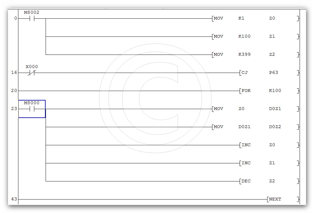 按下X0 將1~~100寫入的D100~~D199,將D100~~D199的數(shù)據(jù)寫入D399~~D300...