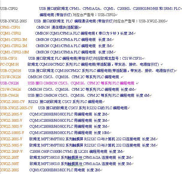 請(qǐng)問(wèn),使用OMRON PLC的同行們,有ONRON各種PLC的編程電纜型號(hào)及其適用對(duì)應(yīng)型號(hào)的PLC清單嗎?因?yàn)槲蚁胭I根PLC編程電纜,但不知道買什么型號(hào)的,想對(duì)應(yīng)的看下,好查找什么樣的編程電纜適用我目前使用的OMRON PLC,希望能夠得到幫助!1
