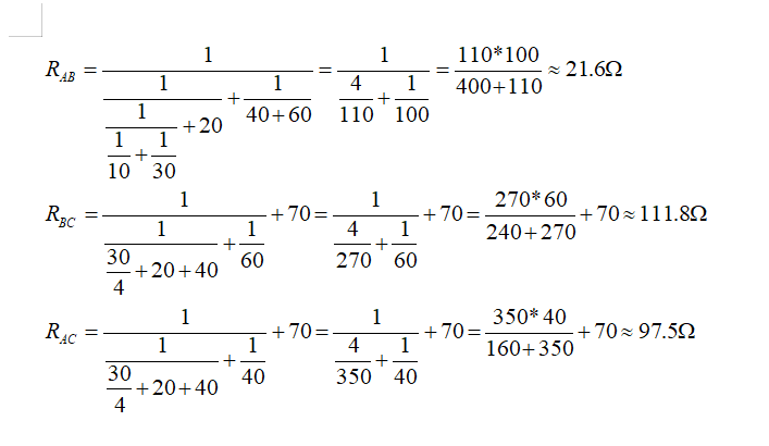 AB之路計算完了,還要計算并聯A---C(70歐上端,下同)---B回路電阻值;