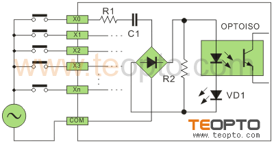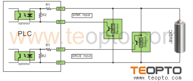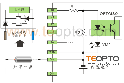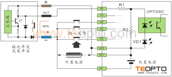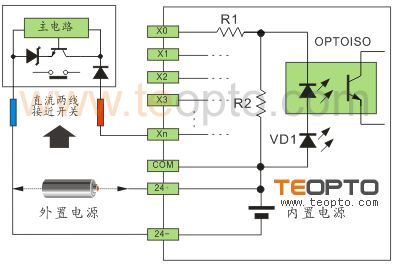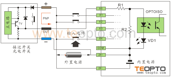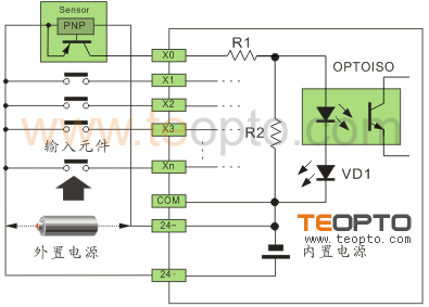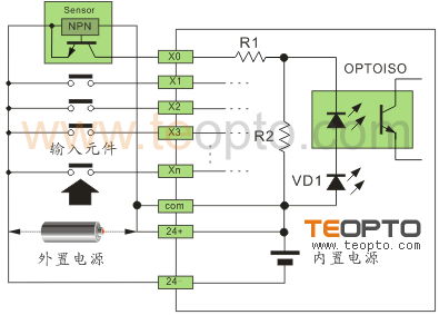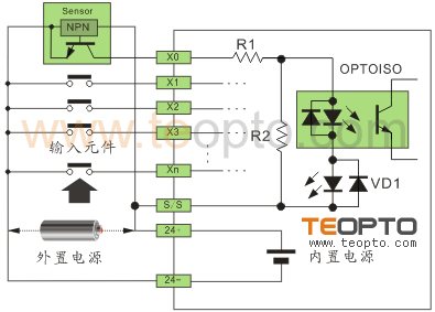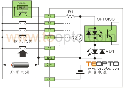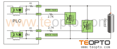 以NPN改為PNP為例,將24V+串電阻后與NPN信號(hào)相并聯(lián)接到輸入點(diǎn)上,則可以達(dá)到PNP的效果。