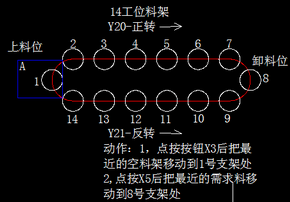 現(xiàn)有一個(gè)十四工位的料架 有一個(gè)上料位 一個(gè)下料位。 要求在上料位點(diǎn)按上料按鈕X3 時(shí) 系統(tǒng)可以把最快速的把空料架移動(dòng)到上料位 。 點(diǎn)按卸料按鈕可以把需求的料最快移動(dòng)到卸料位 |