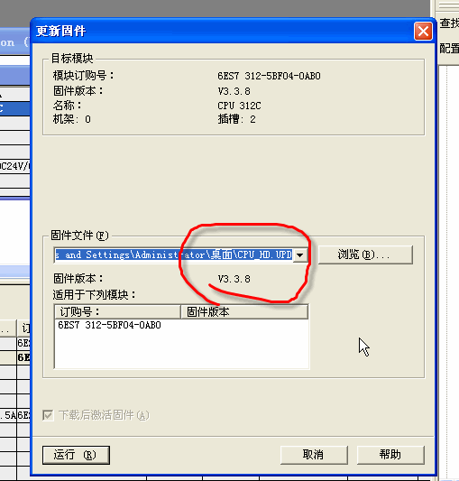 我通過固件更新,選中下載的3.3.8的CPU_HD.UPD文件,然后更新過程很慢,好像通過mpi在上載到在線cpu,更新好了后離線、在線一致了,沒問題了。