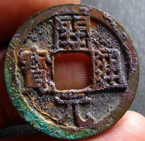 上圖是唐朝的銅質(zhì)開元通寶,至今一千多年,長期埋在地下,并且是雨水充足的南方,才會(huì)有這樣的朱砂銹。