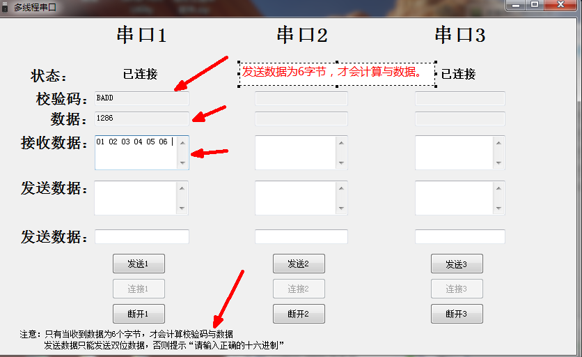 分享一個(gè)本人自己做的多串口調(diào)試軟件,支持3個(gè)串口同時(shí)測(cè)試,自動(dòng)計(jì)算消息頻為6個(gè)字節(jié)的16位校驗(yàn)碼,同時(shí)計(jì)算出第5以及第6字節(jié)的數(shù)據(jù)大小。