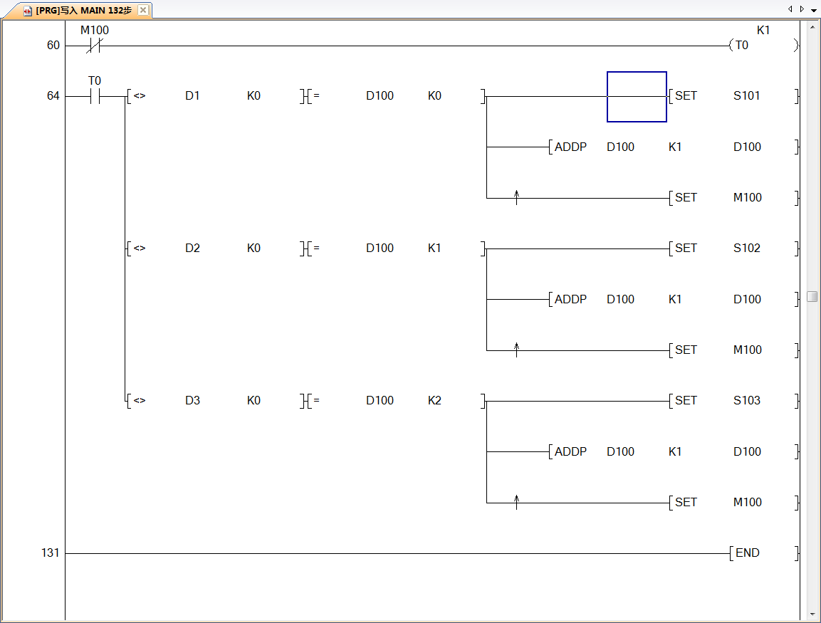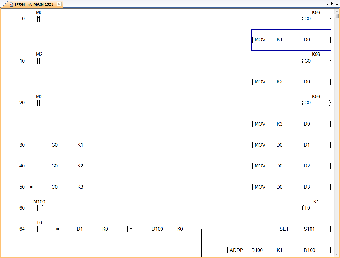 引用引用第15樓gk1234于2020-04-27 16:22發(fā)表的 :利用雙循環(huán)和間接尋址,fx3g為例,1,設(shè)定使用d501-d521寄存器,2,雙循環(huán)輸出,先設(shè)定z1和z2為1,輸出計(jì)數(shù)器c0清零,通過(guò)外循環(huán)索引寄存器z1(1-20),輸出計(jì)數(shù)設(shè)定值為z1,再通過(guò)內(nèi)循環(huán)索引寄存器z2(1-20),當(dāng)d500z2為1時(shí)輸出,計(jì)數(shù)器c0+1,當(dāng)計(jì)數(shù)值和輸出計(jì)數(shù)設(shè)定值z(mì)1相等時(shí),設(shè)定z2為1,完成1個(gè)小周期,接著計(jì)數(shù)器c0清零,z1+1,執(zhí)行下一個(gè)小周期,3,等到內(nèi)循環(huán)到d521時(shí),設(shè)定z1和z2為1,計(jì)數(shù)器c0清零,完成個(gè)大周期。