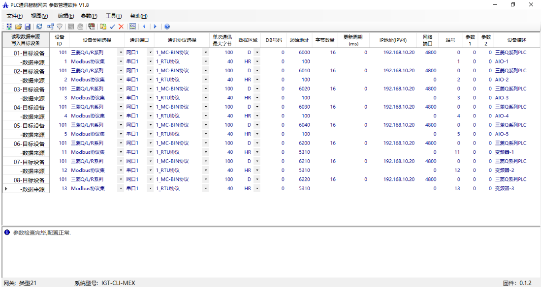 案例是采用的三菱Q系列的PLC,下位設備分別是遠程模塊、變頻器,完整的數據配置表入下圖: