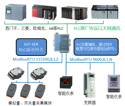 案例是通過一個IGT-SER智能網關,實現遠程IO模塊、智能儀表,變頻器與PLC通訊。