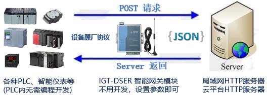 智能網關IGT-DSER集成了多種PLC的原廠協議,方便實現各種PLC與服務端之間的HTTP協議通訊,通過網關的參數配置軟件綁定JSON文件的字段與PLC寄存器地址,配置URL,選定周期模式或者觸發模式,即可通過POST命令,將JSON文件提交給HTTP的服務端; 如果服務端有返回的JSON,網關進行解析后將數據寫入到PLC,實現PLC與HTTP服務端雙向通訊。