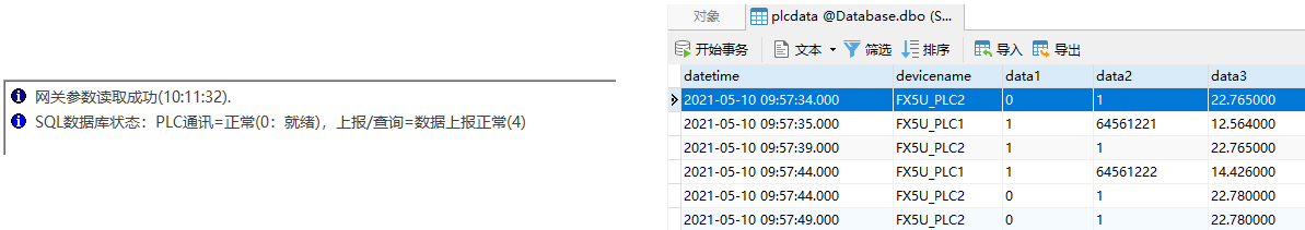 參數(shù)編輯完成后通過‘參數(shù)’->‘參數(shù)寫入到網(wǎng)關(guān)’將參數(shù)下載,然后通過‘工具’->‘重啟網(wǎng)關(guān)’重啟,再通過‘參數(shù)’->‘從網(wǎng)關(guān)讀取參數(shù)’查看網(wǎng)關(guān)的工作狀態(tài),沒有出現(xiàn)紅色圖標的報警消息就是正常的, 通過數(shù)據(jù)庫工具軟件Navicat連接數(shù)據(jù)庫,查看網(wǎng)關(guān)上報到plcdata表的數(shù)據(jù):
