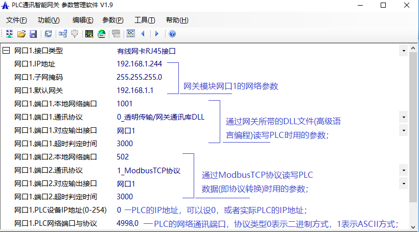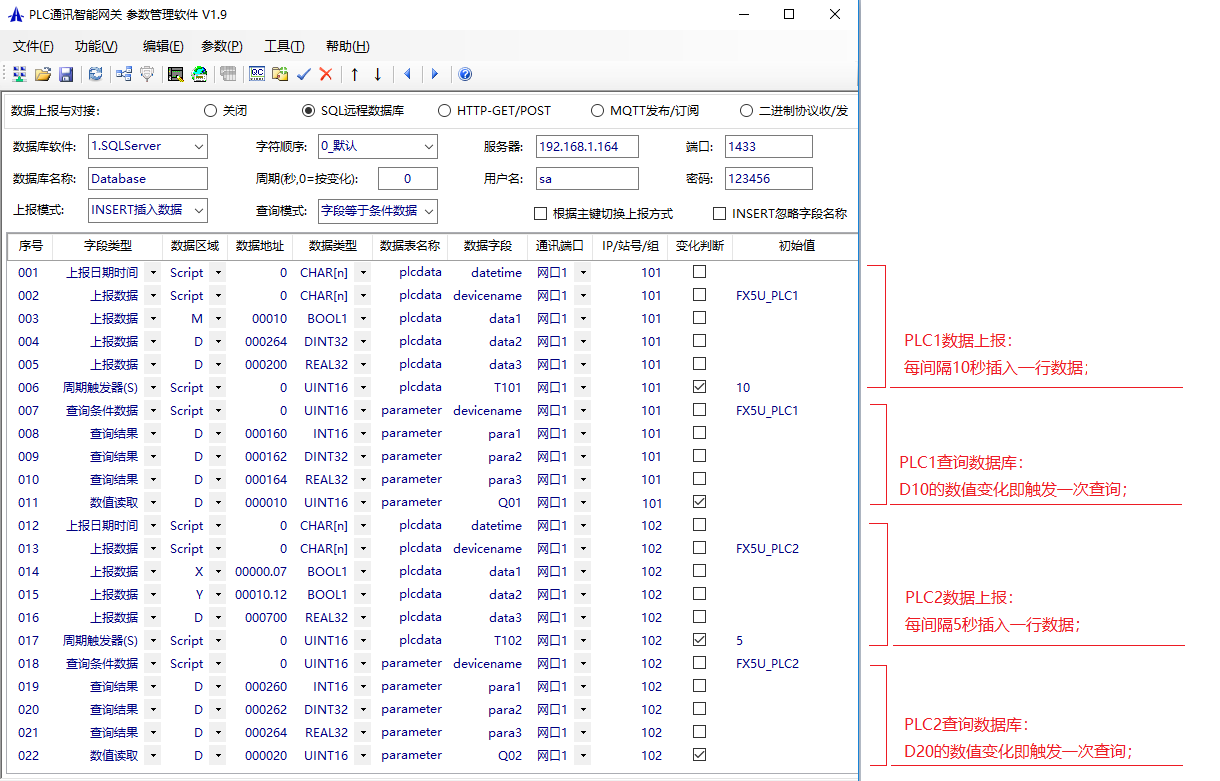 以下是兩臺FX5U與數(shù)據(jù)庫雙向通訊的案例,首先設置網(wǎng)關(guān)的IP,PLC的端口和協(xié)議等參數(shù),如下圖: