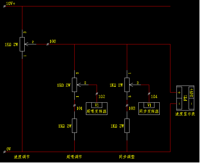 請看圖,第一個電位器為總的速度調節.第二個超喂調節,在反轉的時侯調至最低,防止反轉時同步變頻速度跟不上卡住布.第三個同步電位器安裝在張力桿上,起與主變頻速度作自動調節的作用.張力的大小控制可以用氣缸通過調節閥作調節.