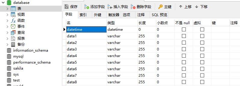 以下案例PLC的型號是1756-L72,采用以太網端口標簽方式采集數據,數據庫是MySQL。首先用Navicat連接服務器數據庫,建立一個數據表,名稱為'abplcdata',數據表設計視圖如下: