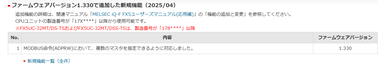 FX5U 固件版本:1.330版,添加的新功能:MODBUS在命令(ADPRW)中,可指定多個主機。