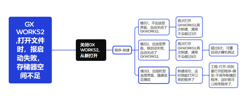 故障現象: 用GXWORKS2,打開以前程序時報啟動失敗,存儲器空間不足,無法改寫程序。