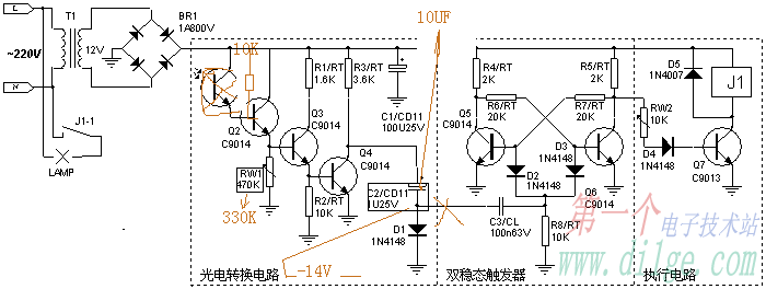 引用引用第31樓風(fēng)流過(guò)客flgk于2011-01-19 20:55發(fā)表的 : 謝謝工控學(xué)子的多次指點(diǎn)我把光電電路和雙穩(wěn)態(tài)電路分離開(kāi),把光敏電阻用10K電阻替代。并把10K電阻的正電源端懸空以作碰觸。C2換為10UF.未觸發(fā)時(shí),C2與D1中間和地之間的電壓為幾毫伏,觸發(fā)時(shí)電壓為—14V,(RW1調(diào)至330K),沒(méi)試驗(yàn)幾次Q4燒毀,換新后,再試驗(yàn),幾次,Q4不觸發(fā),因下班,未及查明原因 [attachment=54474]